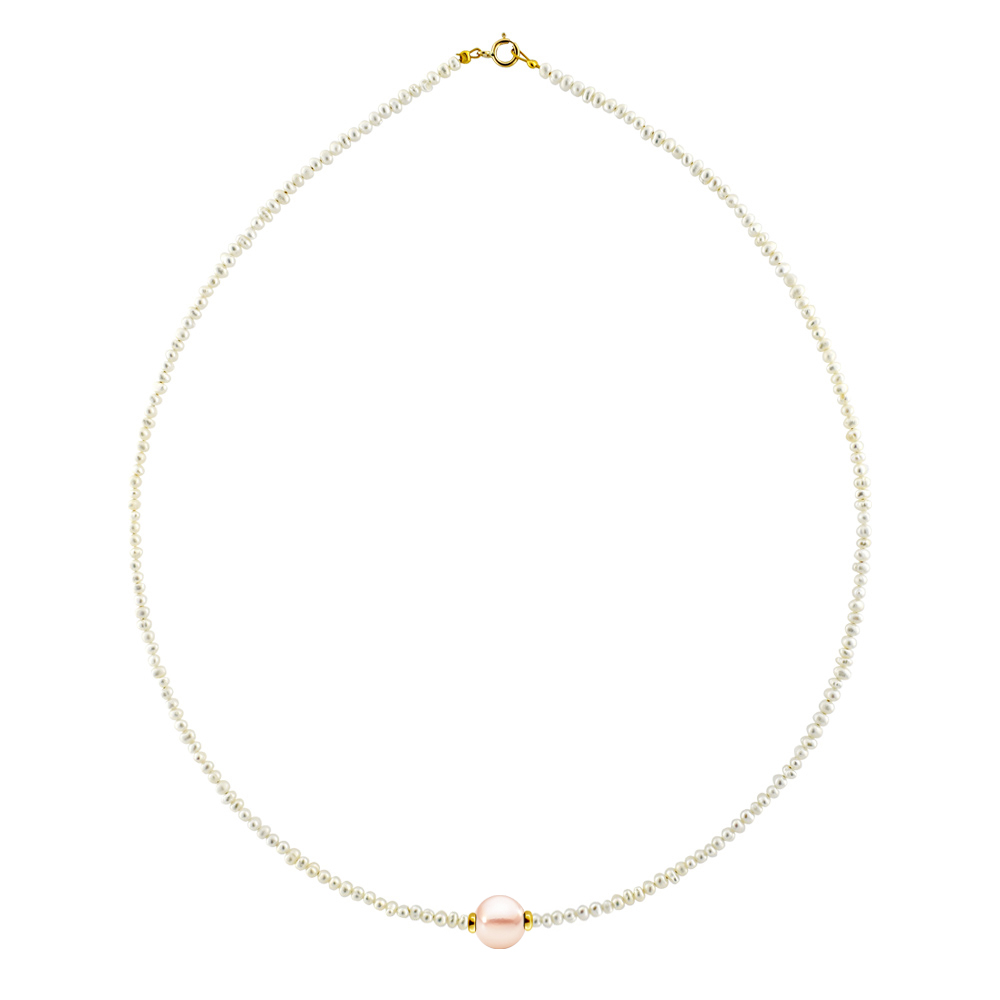 Ένα υπέροχο κολιέ δεμένο με ειδικό ατσαλόσυρμα με λευκά μαργαριτάρια γλυκού νερού Fresh Water Pearl διαμέτρου 2 χιλιοστών, άριστης ποιότητας .Το κεντρικό μαργαριτάρι είναι γλυκού νερού Fresh Water Pearl χρώματος σομον διαμέτρου 8 χιλιοστών. Διαθέτει χρυσά στοιχεία και κούμπωμα από χρυσό 14 καρατίων. Το συνολικό του μήκος είναι 42 εκατοστά.