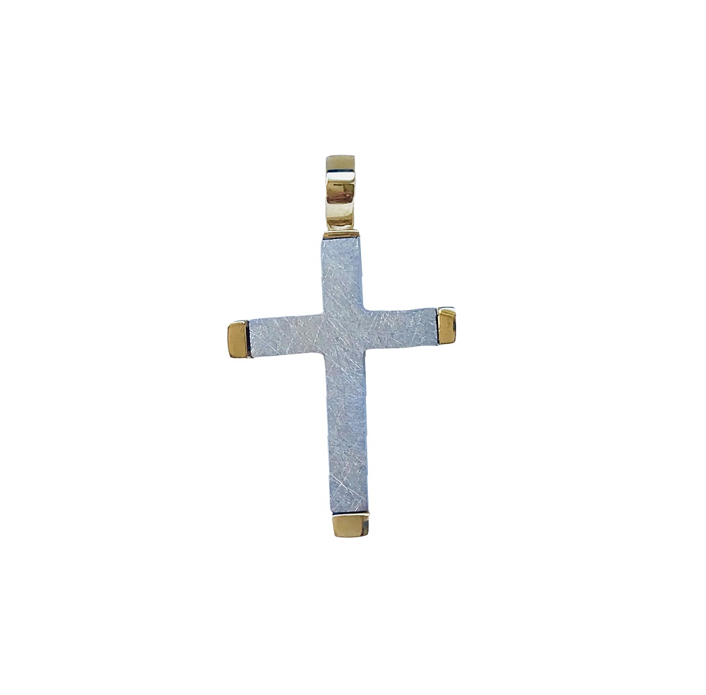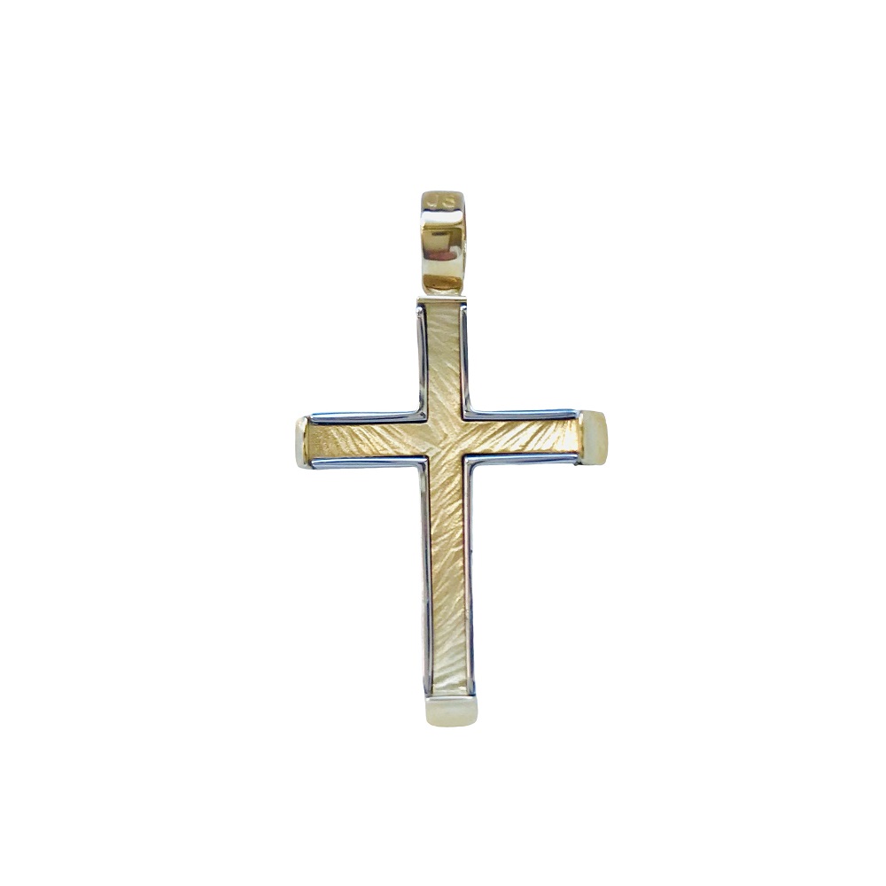 ST0001Σταυρός αντρικός διπλής όψης από χρυσό 14 καρατίων με ανάγλυφο ματ φινίρισμα και λουστρέ λεπτομέρειες.